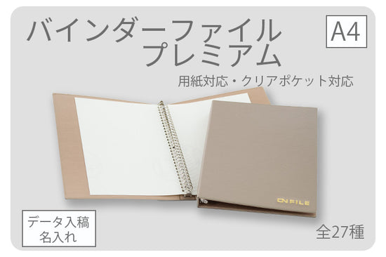 バインダーファイルプレミアムの仕様。多穴金具のゴールド色を使用し、より高級感を追求しました。A5、B5、A4サイズがございます。この商品は限定商品となります。