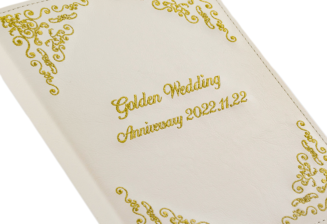 刺繍加工は、なんと言ってもプリントにはない立体感、高級感があるところが魅力です。組み立て前にしかできない箇所へのコンピューターによる刺繍を施してお客様だけの特別な一冊が完成いたします。