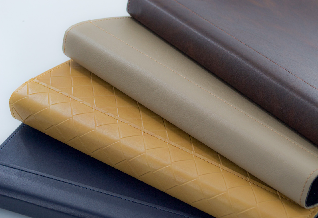 ハイクオリティな本革、水や汚れに強い合成皮革を取り扱っており、お好きな素材やカラーをお選びいただけます。ソフトバインダーファイルは柔らかいので本革だと、エイジングをより一層お楽しみいただけます。合成皮革はアルコール消毒で拭いても変色しないので、業務用ファイルとしても安心してお使いいただけます。