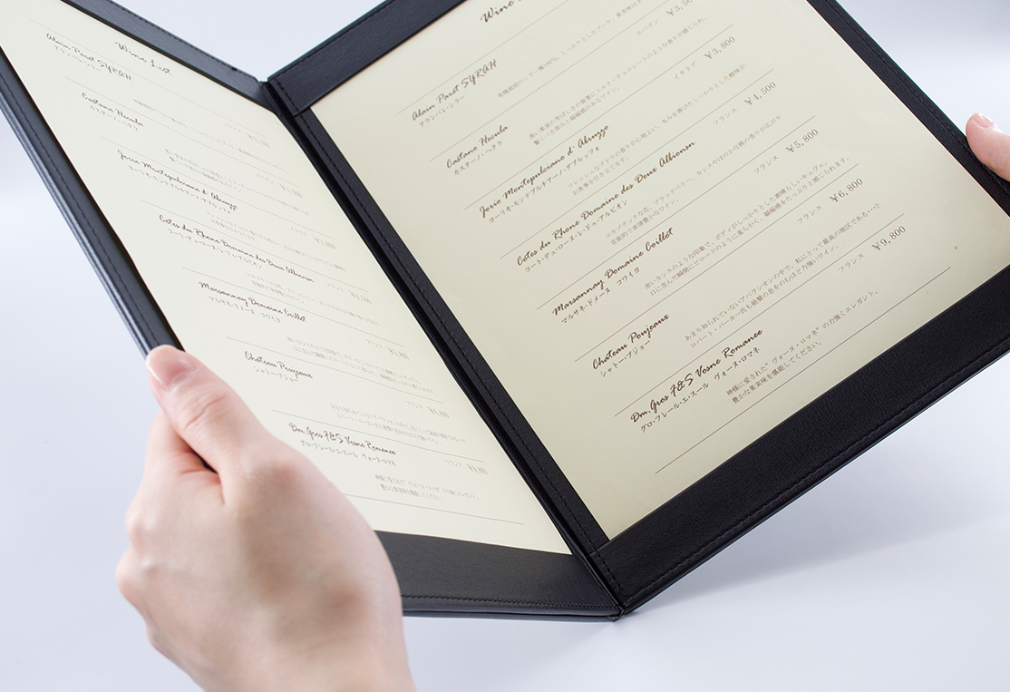 商品ページに載っていないお客様だけの完全フルオーダーのオリジナルメニューブックを製作することも可能ですので、理想のファイルがあるお客様は一度ご相談ください。